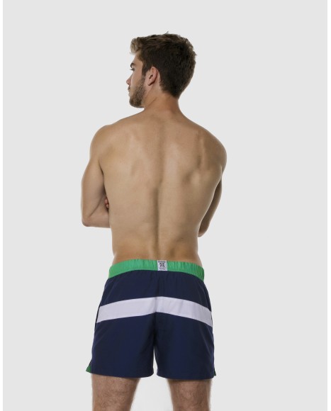 Bañador Corto Munich Combinación de 3 colores Con abertura lateral y cinturilla a contraste Ojetes y cubrecordones grabados Colección: Retro Tejido y goma de máxima calidad. Secado ultrarrápido