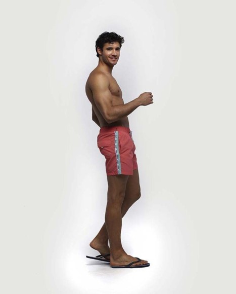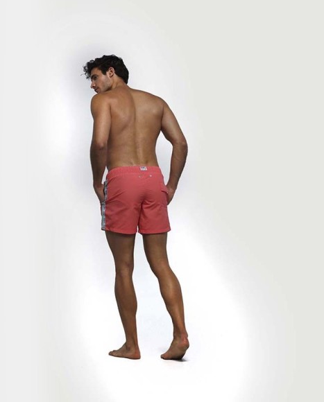 Bañador de hombre corto Munich color liso con franjas laterales, con bolsillos, cintura elástica y cordón para ajustar. Rejilla interior extra suave, ajustable sin roces. Tejido y goma de máxima calidad. Ojetes grabados y cubrecordones con logo.