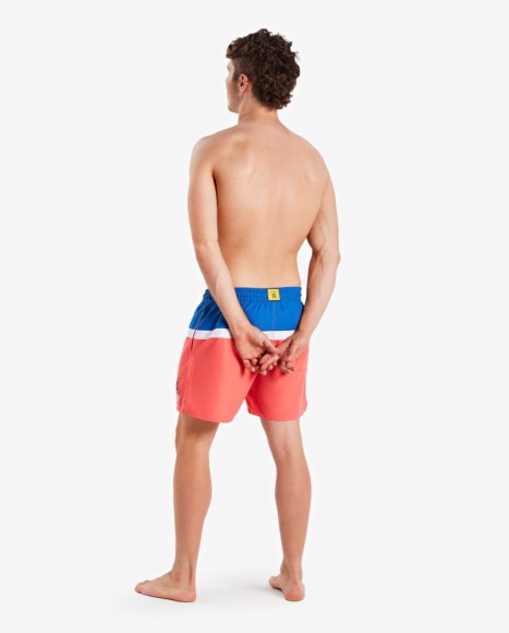 Bañador de hombre de corte largo, confeccionado con tejido suave y de fácil secado, con corte horizontal de color azul, blanco y coral. En el frontal izquierdo hay el logotipo estampado en color azul y blanco. Destaca su cinturilla con goma y cordón ajustable, perfectos para un correcto ajuste al cuerpo. Dispone de bolsillos laterales, otro trasero y uno en el interior. Su forro interior es de tejido suave, agradable al tacto y de secado muy rápido. Composición: EXT. 100% Poliéster/Polyester - FORRO: 95% Poliéster/ Polyester, 5% Elastano/ Elastane Instrucciones de lavado: Lavar a mano / No usar secadora / No planchar / No usar lejía / No lavar en seco / No escurrir