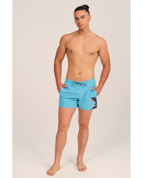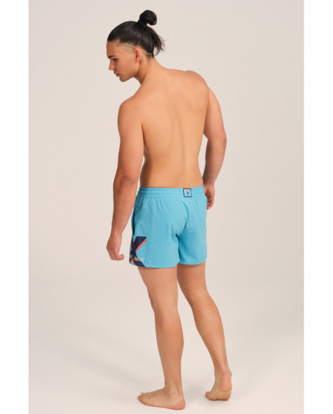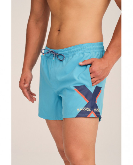 Bañador de hombre en un vibrante tono azul celeste con un distintivo detalle gráfico en el lateral. Fabricado en tejido ligero y de secado rápido, ofrece comodidad y funcionalidad para la playa o la piscina. Su cintura elástica con cordón ajustable proporciona un ajuste seguro y personalizado.