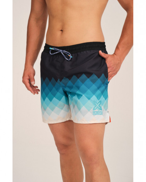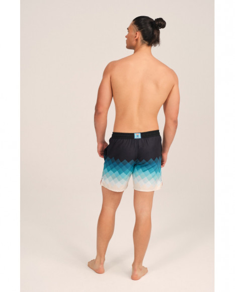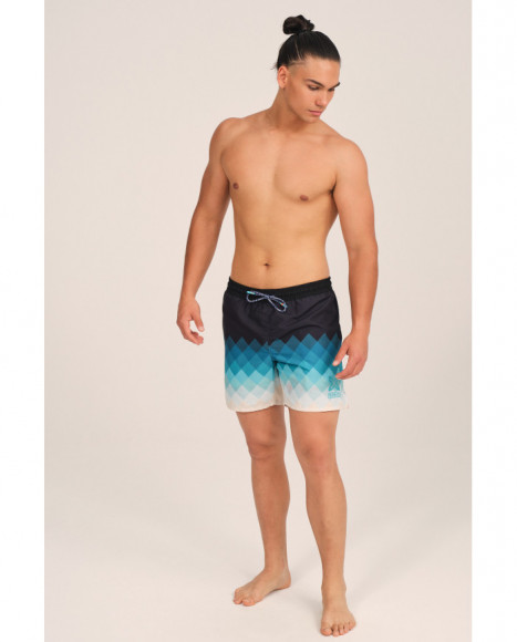 Bañador para hombre con un diseño moderno en degradado de negro a azul con patrón geométrico. Fabricado en tejido ligero y de secado rápido. Su cintura elástica con cordón ajustable garantiza un ajuste cómodo y seguro. Cuenta con bolsillos laterales funcionales y un pequeño logo de la marca en la pernera.