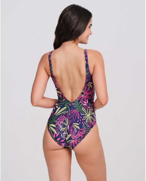 Este bañador de mujer redefine la elegancia costera con un sofisticado diseño de una sola pieza que combina funcionalidad, estilo y efecto reductor. Destaca por su favorecedor escote en pico profundo, realzado con un delicado detalle de abertura “cut-out” y una sutil tira horizontal que aporta un toque arquitectónico moderno. Incorpora un efecto reductor en la zona abdominal que ayuda a moldear y estilizar la silueta, proporcionando una apariencia más firme y armoniosa sin renunciar a la comodidad. Confeccionado con un tejido elástico de alta calidad y compresión ligera, este traje de baño reductor ofrece un ajuste ceñido que moldea la figura de forma cómoda y segura, garantizando libertad de movimiento total en el agua o bajo el sol. El vibrante estampado floral de inspiración tropical incluye matices fucsias, amarillos y verdes sobre un fondo oscuro, convirtiéndolo en una pieza central para tus próximas vacaciones. Ideal para jornadas de playa, piscinas exclusivas o incluso para llevar como body combinado con shorts de lino, este bañador es la elección perfecta para quienes buscan una prenda versátil, resistente al cloro, con efecto moldeador y un acabado de lujo que resalta la belleza natural de la mujer contemporánea.