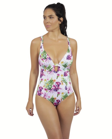 Bañador reductor con copa C, atado al cuello. Escotado con lagrima y con cuello halter. Con estampado de flores tropicales muy colorido y con fondo blanco de lunares, favorecedor y muy juvenil.
