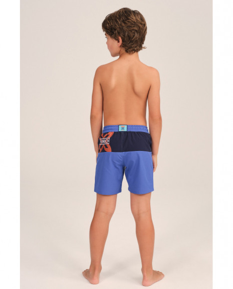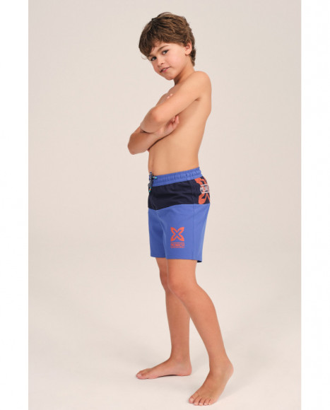 Bañador corto para niño con diseño en tonos azul y negro, con detalles en contraste que aportan un estilo moderno y deportivo. Confeccionado en tejido de secado rápido, cuenta con cintura elástica ajustable para mayor comodidad. Incorpora el logo de Munich en la pierna y en la parte trasera, resaltando el carácter distintivo de la marca.