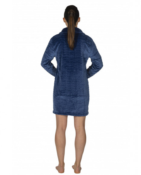 Bata larga de coralina para mujer en un elegante tono azul marino, confeccionada con una textura suave y acogedora, perfecta para los días más fríos. Esta prenda cuenta con un cierre de botones en la parte frontal y amplios bolsillos, añadiendo funcionalidad y comodidad. Su diseño de corte largo y el tejido cálido hacen de esta bata la elección ideal para mantenerse abrigada y confortable en casa, combinando estilo y practicidad en una sola prenda