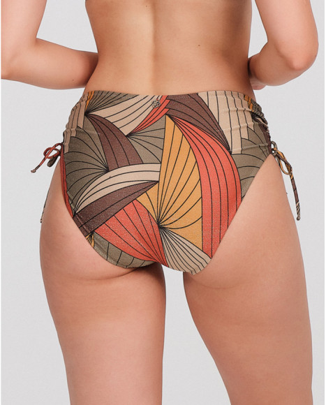 Esta braguita de bikini para mujer destaca por su diseño funcional y estético, ideal para disfrutar de la temporada estival con estilo. Presenta un corte de talle medio que favorece la silueta femenina, proporcionando una cobertura equilibrada y segura. El detalle distintivo reside en sus laterales ajustables mediante lazadas finas, que permiten personalizar el fruncido y adaptar la prenda perfectamente a la forma de la cadera. El tejido técnico de alta calidad ofrece un acabado ligeramente satinado que resalta el intrincado patrón geométrico de inspiración retro. Los tonos tierra y ocres se entrelazan en líneas sinuosas y gráficos en forma de abanico, creando un efecto visual sofisticado y dinámico. Esta pieza es perfecta para combinar con tops lisos o coordinados, siendo una opción versátil tanto para días de playa como para relajarse en la piscina. Su resistencia al cloro y al sol garantiza una durabilidad superior, manteniendo la intensidad de sus colores y la elasticidad del material tras cada uso.