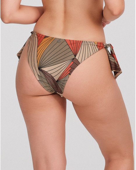 Esta braguita de bikini para mujer destaca por su diseño vibrante y contemporáneo, ideal para quienes buscan renovar su colección de baño con estilo. Confeccionada en un tejido elástico de alta calidad, ofrece una adaptabilidad excepcional al cuerpo, garantizando libertad de movimiento y comodidad durante todo el día bajo el sol. El diseño presenta un sofisticado patrón geométrico con líneas que recuerdan a un estampado de rayas modernizado en tonos tierra, anaranjados y bronce, realzado por un acabado ligeramente brillante que captura la luz con elegancia. El detalle principal son sus lazadas laterales ajustables, que permiten personalizar el ajuste a la cadera y aportan un toque femenino y juvenil. Este traje de baño es perfecto para disfrutar de la playa o la piscina, combinando funcionalidad con una estética de tendencia boho-chic. Su tejido resistente al cloro y al salitre asegura una durabilidad prolongada, manteniendo la intensidad de sus colores tras cada uso. Una prenda esencial para una silueta estilizada y un look veraniego impecable.