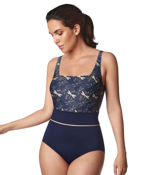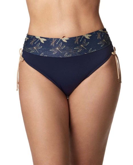 Braga de bikini clásica a cadera, muy cómoda y perfecta para todo tipo de siluetas. Un modelo muy especial de cobertura media-alta, con corte en la cintura, muy favorecedora. Comodidad sin perder la estética. La prenda está completamente forrada y la parte posterior presenta un corte estándar. Con tejido lurex en azul marino y libélulas y toques dorados. Composición: EXT: 55% Poliamida Reciclada - 23% Poliamida - 14% Hilo Metalico - 8% Elastano / INT: 84% Poliéster - 16% Elastano Instrucciones de lavado: Lavar a mano / No usar secadora / No planchar / No usar lejía / No lavar en seco / No escurrir