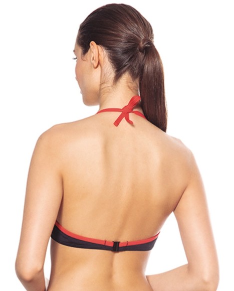 Sujetador de bikini con copa, aro y tirantes al cuello con lazo. Color negro liso con detalles en rojo. Hebilla metálica de cierre en la espalda. Disponible en copa B. Composición: 85% Poliamida - 15% Elastano