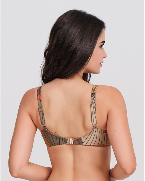 Este top de bikini para mujer destaca por su sofisticado diseño de copas con aros, que garantiza una sujeción óptima y un realce natural del busto. El modelo presenta un patrón geométrico de inspiración retro en tonos tierra, naranja y mostaza, con un acabado ligeramente brillante que aporta un toque de lujo bajo el sol. Confeccionado con tejidos elásticos de alta calidad, ofrece una comodidad excepcional y una durabilidad superior frente al cloro y el salitre. Los tirantes ajustables permiten una adaptación personalizada a cada silueta, mientras que el cierre trasero asegura un ajuste firme para actividades acuáticas. Su elegancia atemporal lo convierte en la elección perfecta para quienes buscan un estilo chic tanto en la playa como en la piscina. Combínalo con su braga a juego para crear un conjunto de baño armonioso o mézclalo para un look más atrevido. Esta pieza esencial de moda baño une funcionalidad técnica y tendencia artística para realzar tu figura con sutileza y carácter.