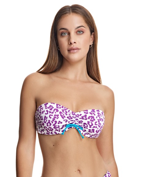 Precioso top de bikini bandeau con aros. Diseño muy original con tirantes extraíbles con lazada turquesa en el escote. Best Seller Carey. Realza tu figura en la playa y sienta muy bien para todo tipo de pechos. Ideal para conseguir el bronceado perfecto. La espalda lleva la goma con silicona que permite una mayor sujeción. Tirantes extraíbles quita y pon. Combínalo con su parte de abajo a juego para un conjunto ideal. Favorecedor estampado animal print en tono morado dándole un look modernizado al clásico estampado de piel. Otra información: Con aro - Sin tirantes Composición: EXT: 80% Poliamida - 20% Elastano / INT: 52% Elastano - 34% Lycra - 14% Poliamida Instrucciones de lavado: Lavar a mano / No usar secadora / No planchar / No usar lejía / No lavar en seco / No escurrir