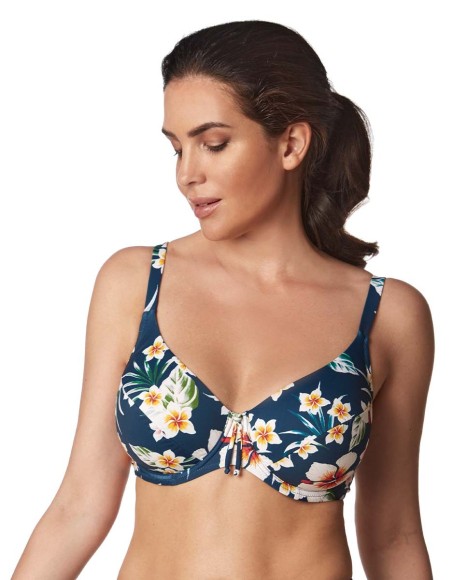 Sujetador de bikini con aros de capacidad y refuerzo bajo pecho, para una perfecta sujeción. Especialmente diseñado para pechos más generosos. Recoge y situar el pecho correctamente. Se ofrece en gran amplitud de copas (de la C a la G) porque su excelente vestibilidad. Forro y estructura interior de la prenda con efecto reductor. Tirante ancho regulable para una perfecta sujeción. Estampado con flores de hibiscos muy favorecedor y juvenil. Otra información: Con aro - Reductor - Máxima sujeción - De capacidad Composición: EXT: 80% Poliamida - 20% Elastano / INT: 48% Elastano - 27% Lycra - 25% Poliamida Instrucciones de lavado: Lavar a mano / No usar secadora / No planchar / No usar lejía / No lavar en seco / No escurrir