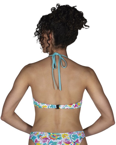 Sujetador de bikini Cocoa con copa y escote abierto. Tiene un aro continuo y copa de foam extraíble. Con tirante regulable que permite varias posiciones. Disponible en Copa B. Estampado tipo pasley multicolor. Otra información: Con aro - Con foam - Multiposición - Triángulo Composición: EXT: 82% Nylon, 18% Spandex / INT: 92% Poliéster, 8% Spandex / COPA: 100% Poliéster Instrucciones de lavado: Lavar a mano / No usar secadora / No planchar / No usar lejía / No lavar en seco / No escurrir