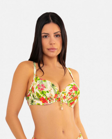 Top de bikini mujer color beige con estampado tropical y detalle de cuentas