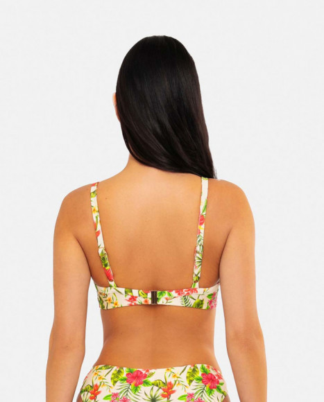 Top de bikini mujer color beige con estampado tropical y lazo frontal