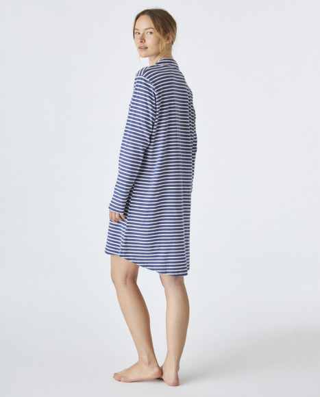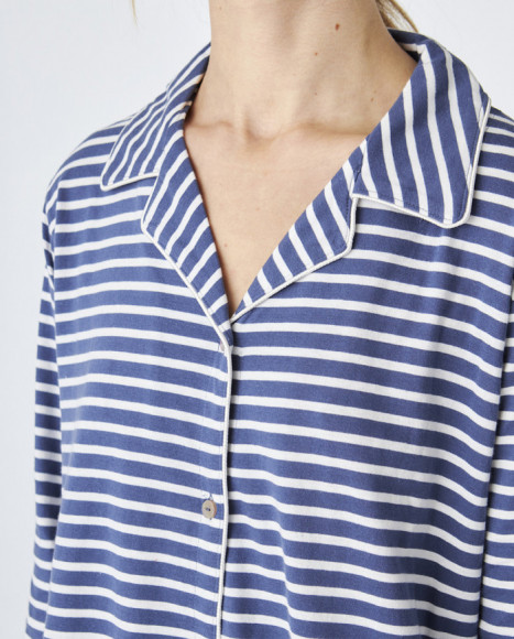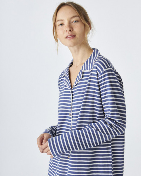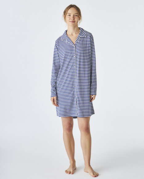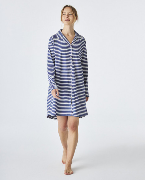 Camisón de algodón de manga larga para mujer, confeccionado en un suave tejido de rayas en tonos azul marino y blanco. Su diseño tipo camisa, con cuello camisero y cierre frontal con botones, le aporta un estilo clásico y relajado. El corte holgado y su longitud por encima de la rodilla ofrecen una gran comodidad y libertad de movimiento, perfecto para descansar con estilo. El patrón de rayas añade un toque fresco y atemporal