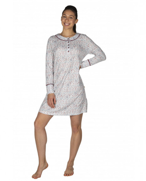 Camisón de manga larga para mujer en color blanco, decorado con un elegante estampado geométrico en tonos suaves. Incluye una tapeta de botones en el escote y ribetes en contraste en el cuello y puños, que le aportan un toque de sofisticación y estilo. Confeccionado en un tejido suave y ligero, este camisón es perfecto para disfrutar de noches de descanso con comodidad y elegancia, ideal para quienes buscan una prenda práctica y estilosa para el hogar