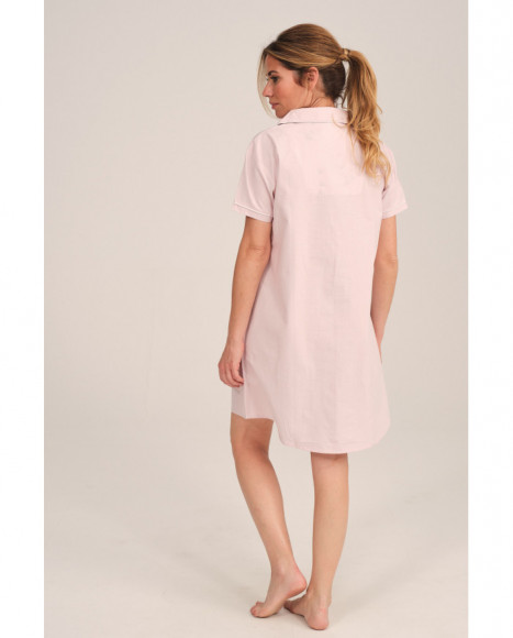 Camisón para mujer en color rosa pastel, diseñado con un estilo relajado y cómodo. Presenta un cuello clásico, botones frontales y un bolsillo en el pecho, ideal para descansar con estilo. Su tejido ligero lo convierte en una opción perfecta para cualquier temporada.
