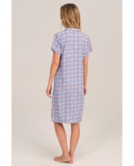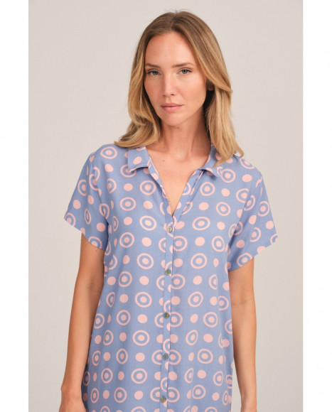 Camisón para mujer de manga corta confeccionado en tejido ligero y suave. Su diseño azul incorpora un divertido estampado de círculos en tonos pastel, cierre frontal con botones y cuello camisero, ofreciendo comodidad y estilo.