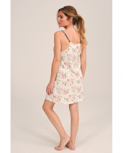 Camisón para mujer confeccionado en un suave tejido con un delicado estampado floral en tonos pastel. Presenta tirantes ajustables en contraste y un diseño fluido que ofrece comodidad y frescura, ideal para las noches cálidas.