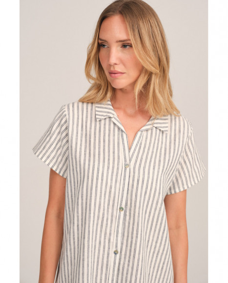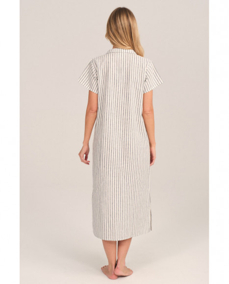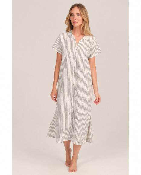 Camisón largo para mujer confeccionado en un tejido ligero con un sofisticado diseño de rayas blancas y negras. Incluye manga corta, cuello clásico y una fila de botones frontales que le aporta un toque elegante y práctico. Su corte fluido y cómodo lo convierte en una opción perfecta para el descanso o para momentos de relax en casa.