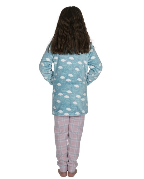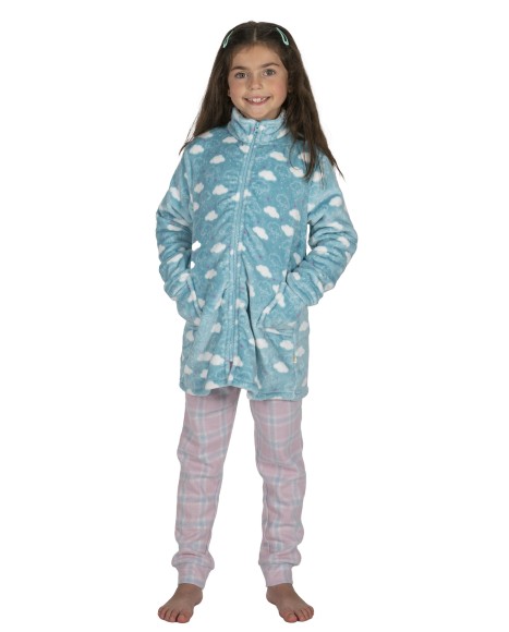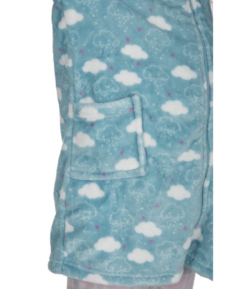 Bata de niña de coralina estampada con mini nubes, con cremallera y bolsillos en los laterales.