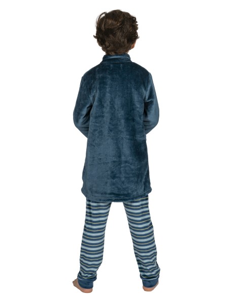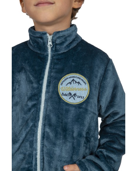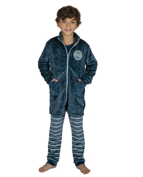 Bata de niño de coralina con cremallera y bolsillos en los laterales, en color azul petróleo.