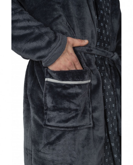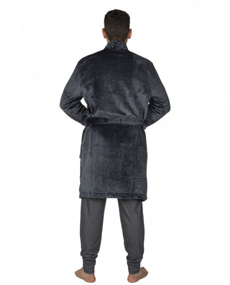 Bata de coralina para hombre en color gris oscuro, diseñada con tejido de felpa suave que proporciona calidez y comodidad. Incluye un cinturón a juego y detalles en los bolsillos y solapas con un delicado estampado geométrico. Ideal para momentos de descanso y relajación en casa