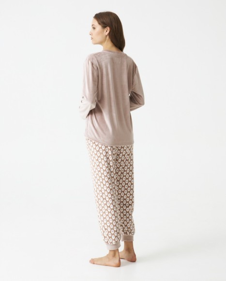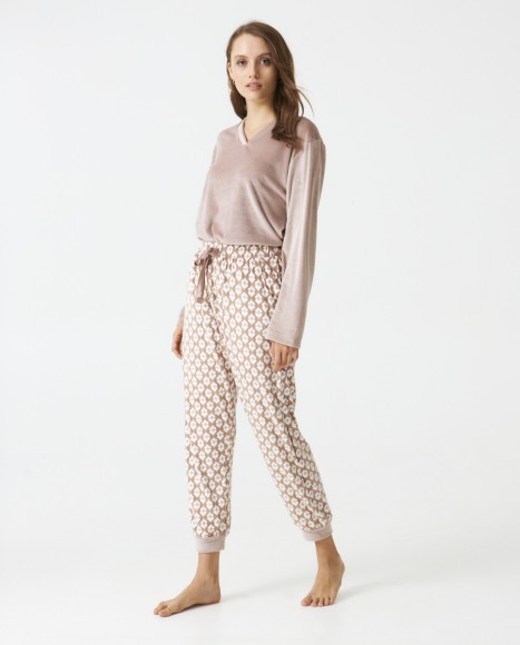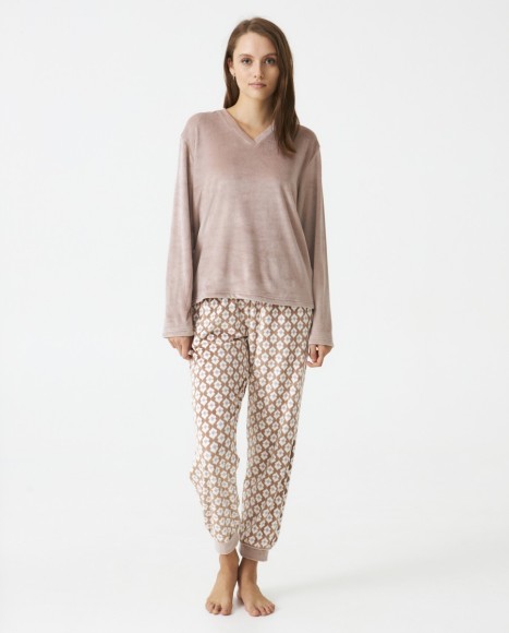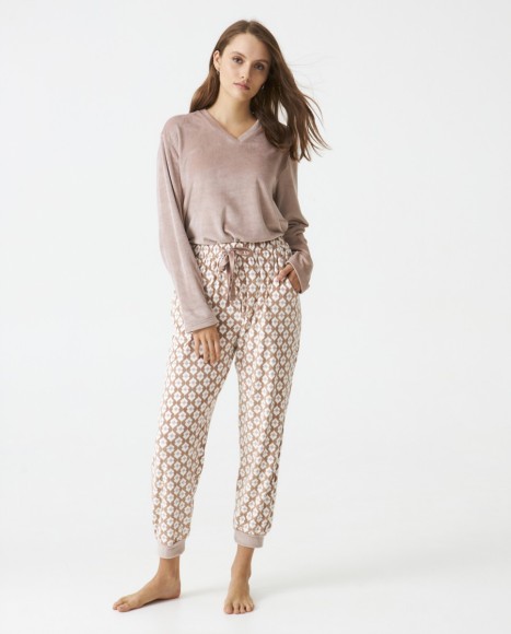 Pijama señora en terciopelo super soft. Top liso cuello pico. Pantalón estampado geométrico. Bolsillos laterales. Cinta satinada en cintura.