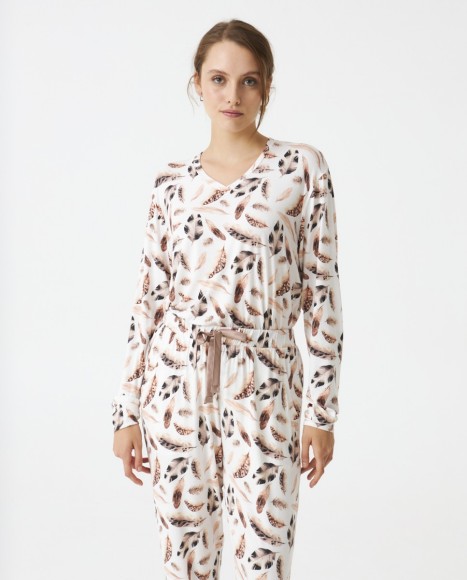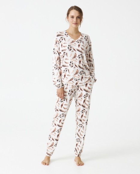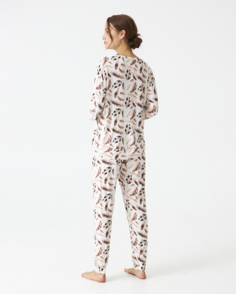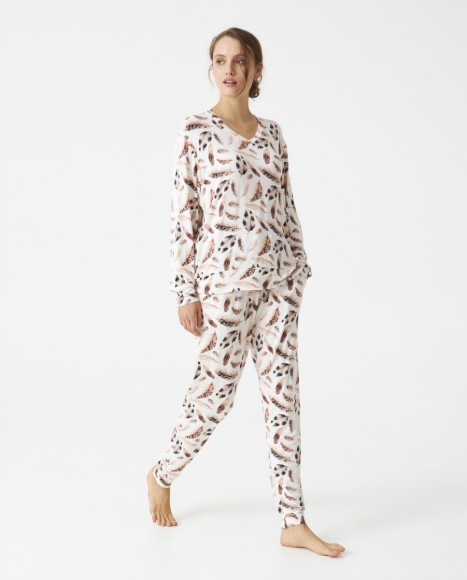 Pijama señora modal. Estampado plumas. Puños en mangas y bajos pantalón. Bolsillos laterales.