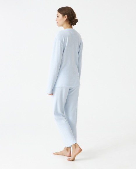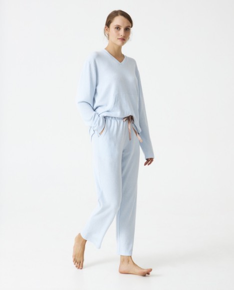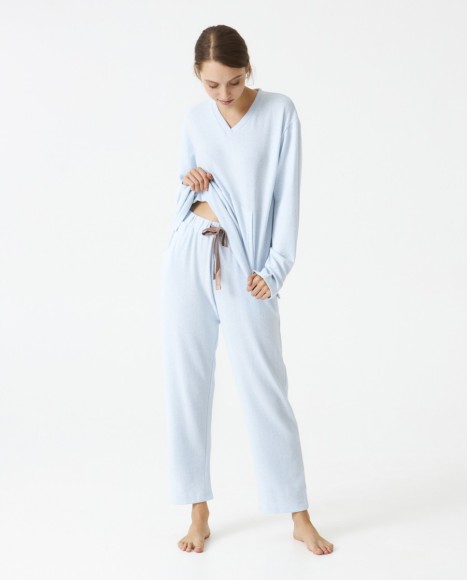Pijama señora tejido perchado extra suave. Cuello pico. Bolsillos centrales. Pantalón con cinta satinada contraste.