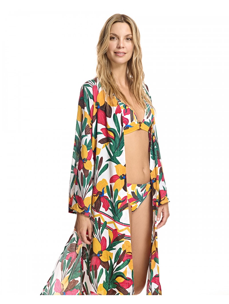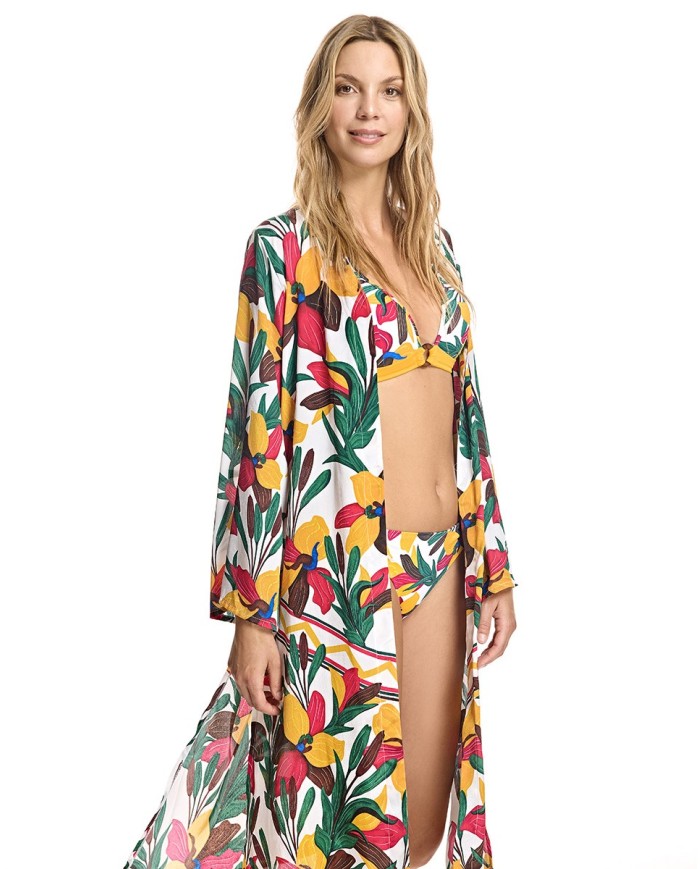 KiMono Ory largo con estampado de hojas. Composición: 100% Poliéster Instrucciones de lavado: Lavar a mano / No usar secadora / No planchar / No usar lejía / No lavar en seco / No escurrir