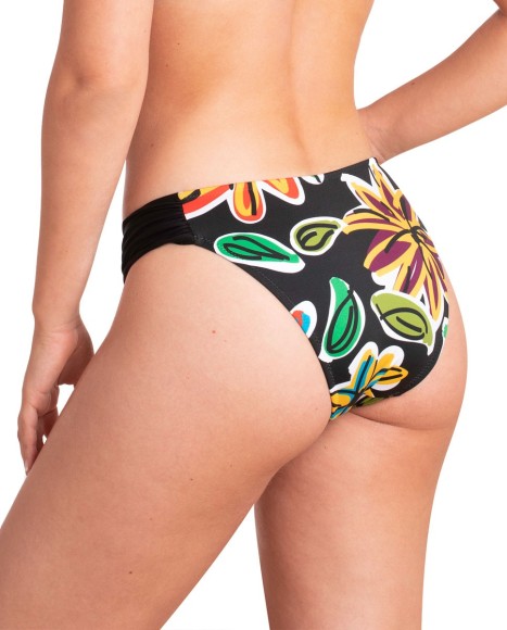 Elegante braguita de bikini de tiro bajo decorada con drapeados en los laterales, que permites regular la altura. La prenda está completamente forrada y la parte posterior presenta un corte estándar. EXT. 83% Poliamida - 17% Elastano / INT. 84% Poliéster - 16% Elastano