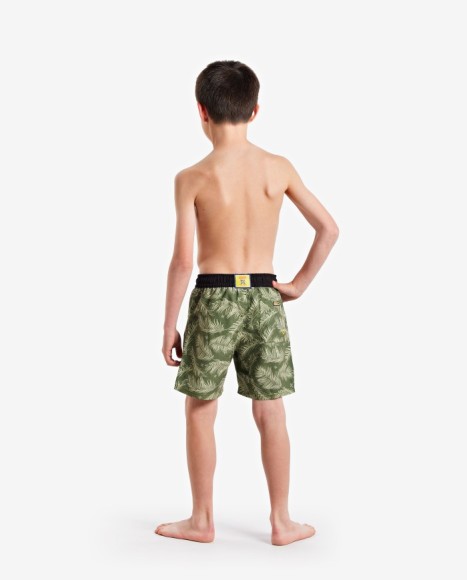 Bañador de niño de corte largo confeccionado con tejido suave y de fácil secado de color caqui estampado con hojas de palmera. En el frontal izquierdo hay el logotipo bordado en color crudo. Destaca su cinturilla con goma y cordón ajustable, perfectos para un correcto ajuste al cuerpo. Dispone de bolsillo trasero. Su forro interior es de tejido suave, agradable al tacto y de secado muy rápido. Composición: EXT. 100% Poliéster/Polyester - FORRO: 95% Poliéster/ Polyester, 5% Elastano/ Elastane Instrucciones de lavado: Lavar a mano / No usar secadora / No planchar / No usar lejía / No lavar en seco / No escurrir