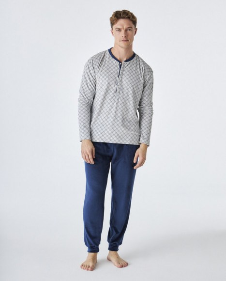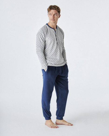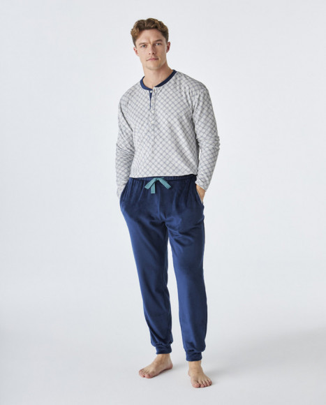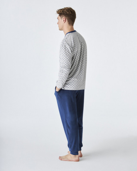 Pijama de terciopelo de hombre con camiseta de manga larga en color gris con un sutil estampado geométrico y detalles en azul en el cuello y la tapeta de botones. El pantalón de corte clásico está confeccionado en tejido aterciopelado en color azul marino, aportando un toque suave y cálido, ideal para las noches más frías. Cintura elástica para mayor comodidad