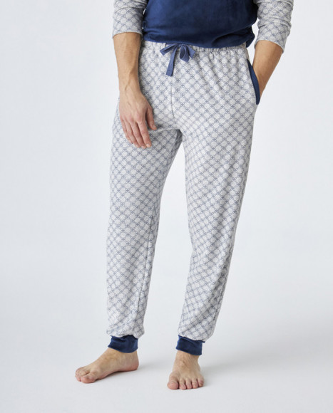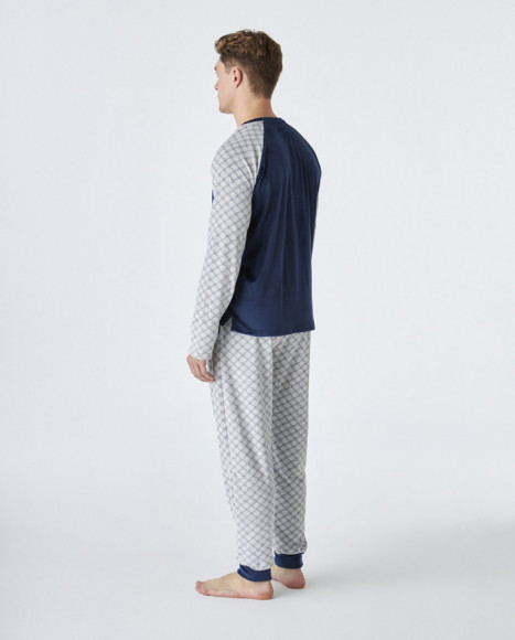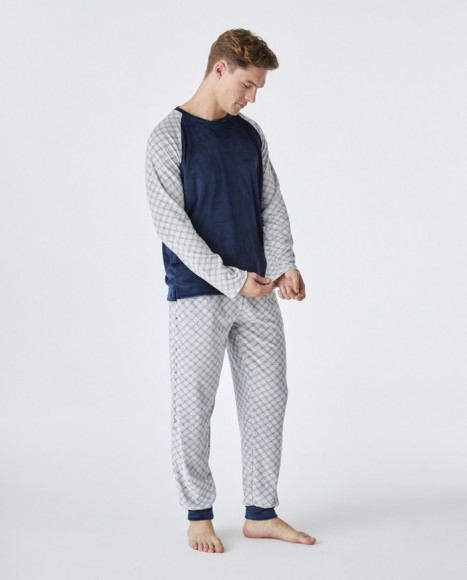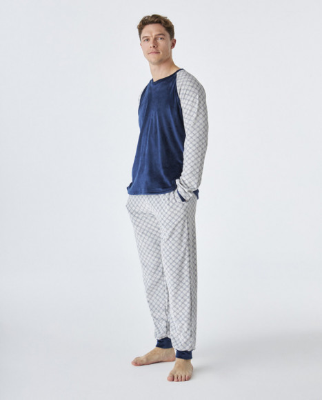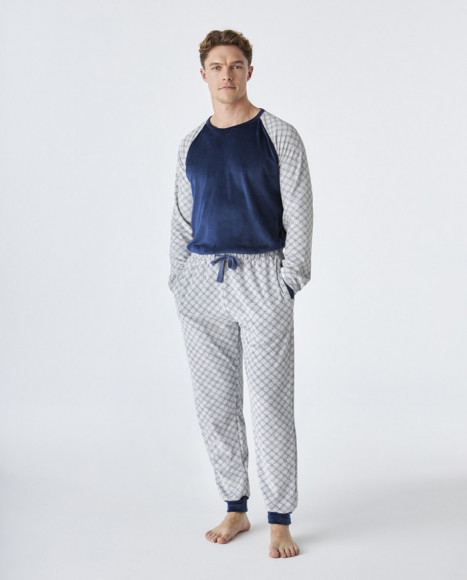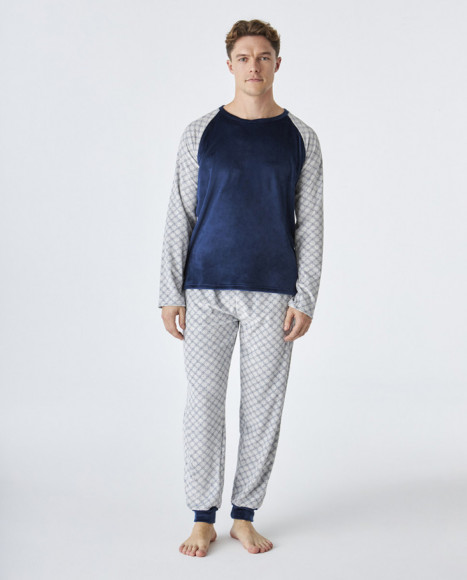 Pijama de terciopelo de hombre compuesto por una camiseta de manga larga en tejido aterciopelado color azul marino y mangas con estampado geométrico en tonos grises. El pantalón presenta un diseño a juego con el mismo estampado geométrico en gris y puños en azul marino. Un conjunto cómodo y elegante para las noches de invierno. Cintura elástica para mayor ajuste