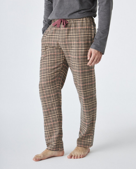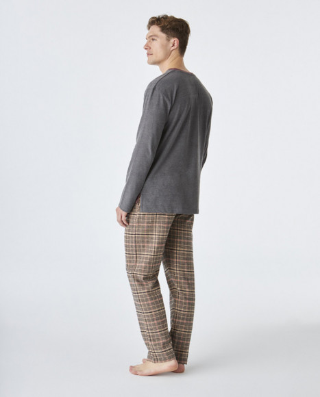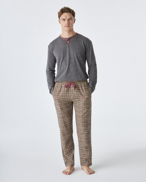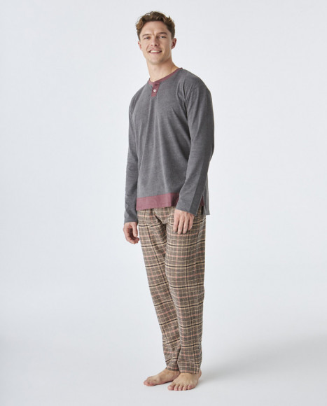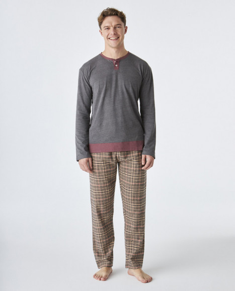 Pijama de algodón de hombre compuesto por camiseta de manga larga en gris oscuro con detalles burdeos en el cuello y los botones, combinado con un pantalón de cuadros en tonos marrones. El diseño cómodo y cálido es perfecto para las noches frescas de otoño e invierno, asegurando una agradable sensación al dormir