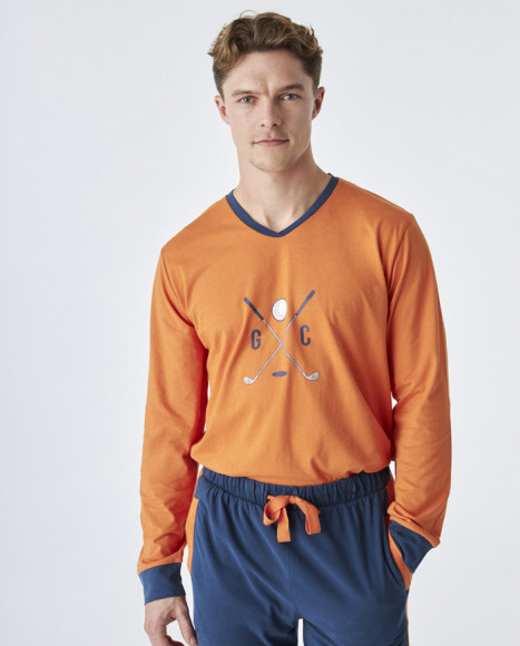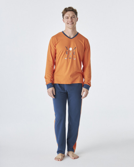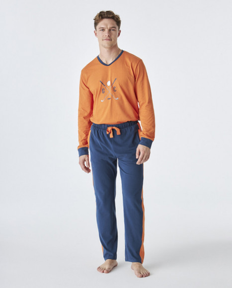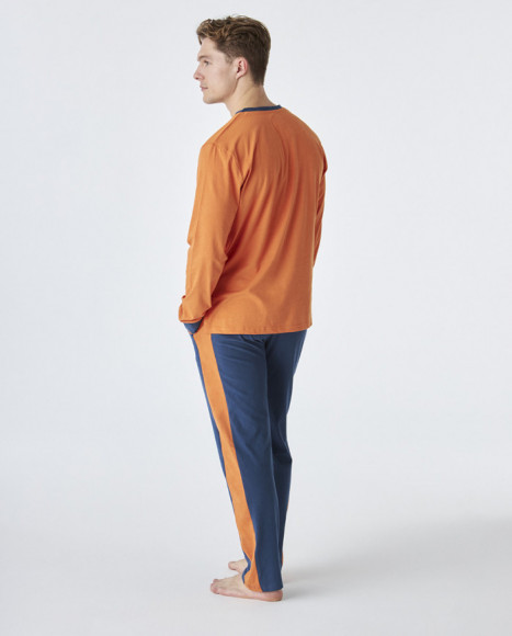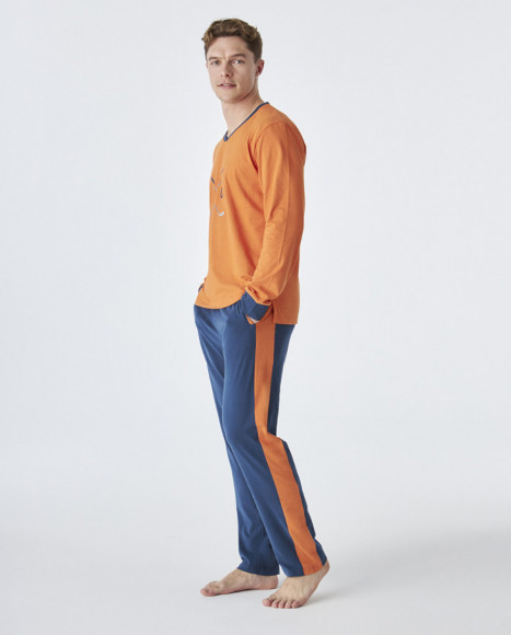 Pijama de algodón de hombre con camiseta de manga larga en color naranja con cuello en V y un diseño gráfico en la parte frontal, acompañado de pantalón azul con detalles en los costados en el mismo tono naranja. Ideal para las noches de otoño e invierno, ofreciendo comodidad y estilo