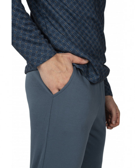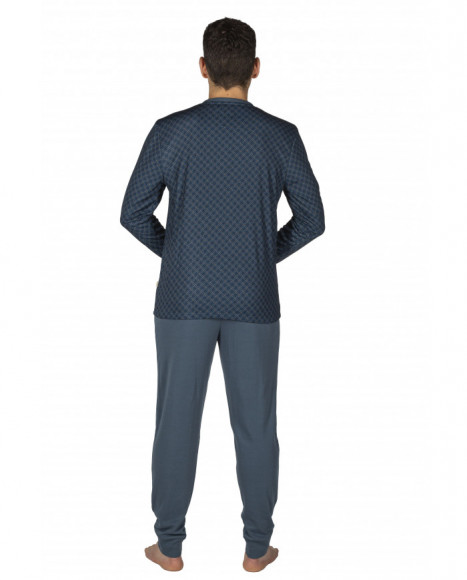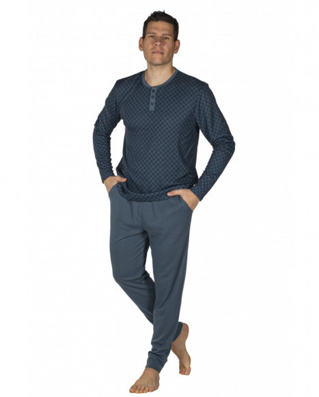 Pijama para hombre en color azul grisáceo con un diseño geométrico en la camiseta de manga larga. La camiseta cuenta con un cuello de botones y mangas lisas que combinan con el pantalón en el mismo tono, creando un conjunto coordinado y elegante. Fabricado en un tejido suave y cómodo, perfecto para las noches de descanso