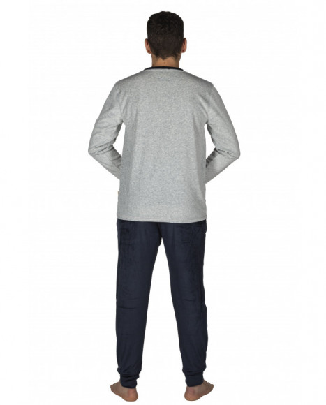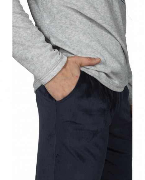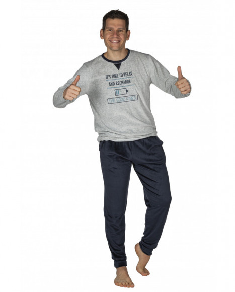 Pijama de terciopelo para hombre en color azul marino, diseñado para brindar comodidad y estilo en el descanso. La camiseta de manga larga en gris claro presenta un mensaje gráfico "It's time to relax and recharge - The good vibes", que añade un toque divertido y relajante. El pantalón, en azul marino y de textura suave, completa este conjunto perfecto para disfrutar de una noche de descanso confortable. Ideal para quienes buscan un pijama funcional con un toque de personalidad