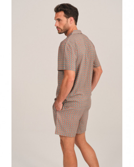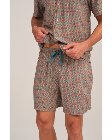 Conjunto de pijama corto para hombre compuesto por camisa de manga corta con botones y pantalón corto a juego. Presenta un original estampado geométrico multicolor que añade un toque de estilo y modernidad.