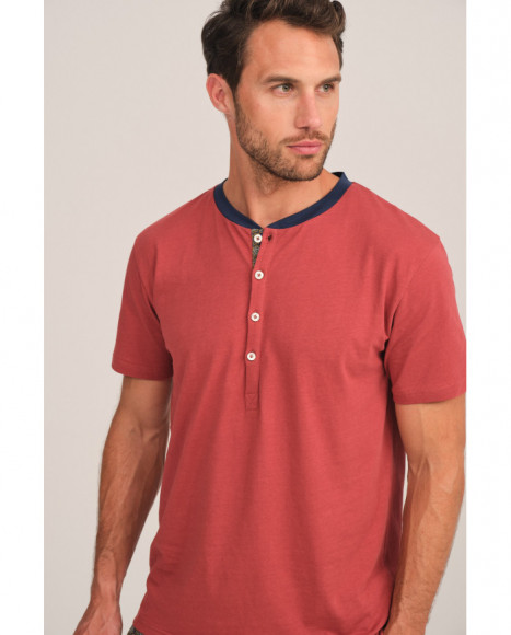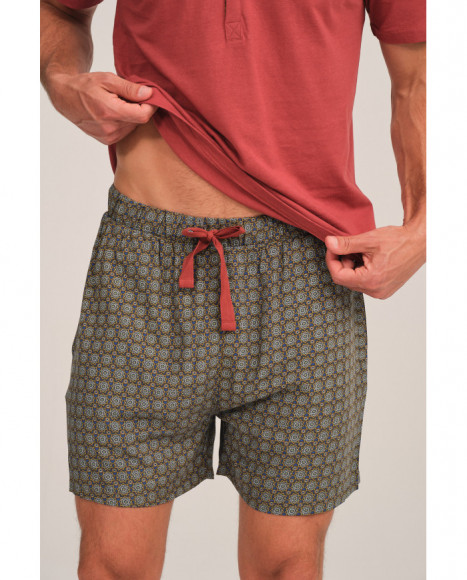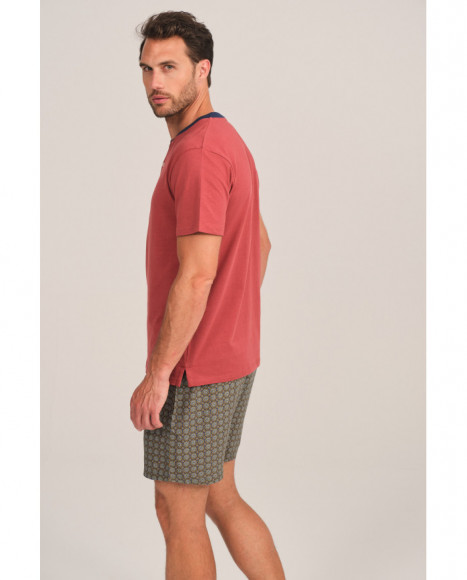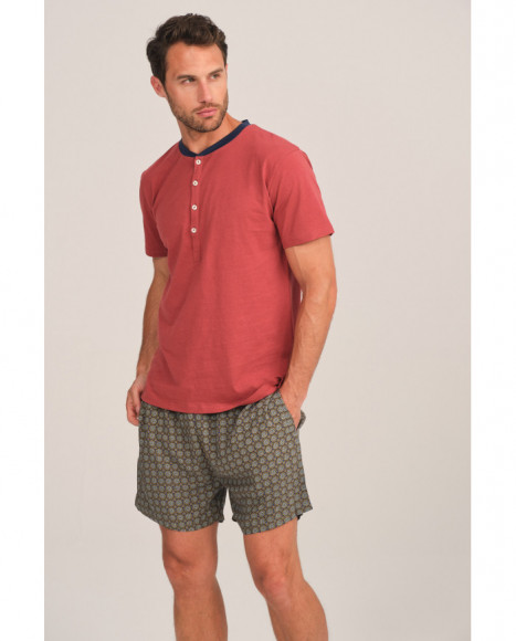 Pijama corto para hombre compuesto por una camiseta de manga corta en rojo con cuello azul y cierre de botones decorativos, acompañado de pantalón corto con un elegante estampado geométrico en tonos oscuros.