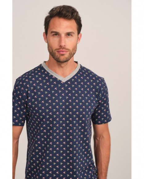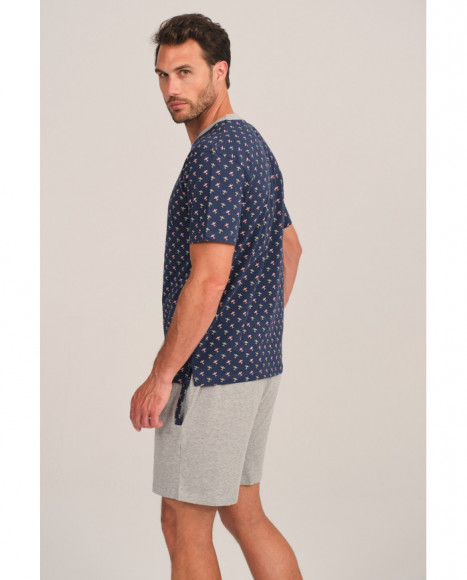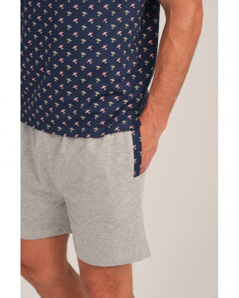 Pijama para hombre compuesto por camiseta azul marino con cuello en V y estampado mini de figuras geométricas multicolor, combinado con un cómodo pantalón corto gris. Diseñado en tejido ligero y transpirable,