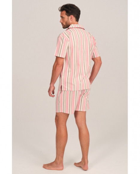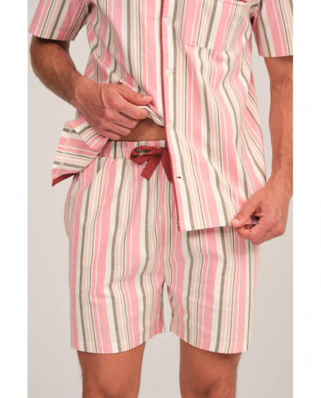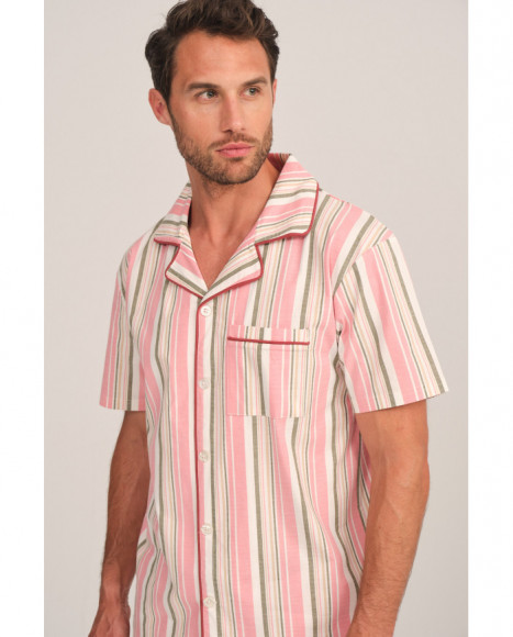 Pijama para hombre con diseño de rayas en tonos pastel, que combina rosa, beige y blanco, aportando un estilo fresco y elegante. Incluye una camisa de manga corta con cuello clásico y un bolsillo frontal, junto con pantalones cortos a juego.