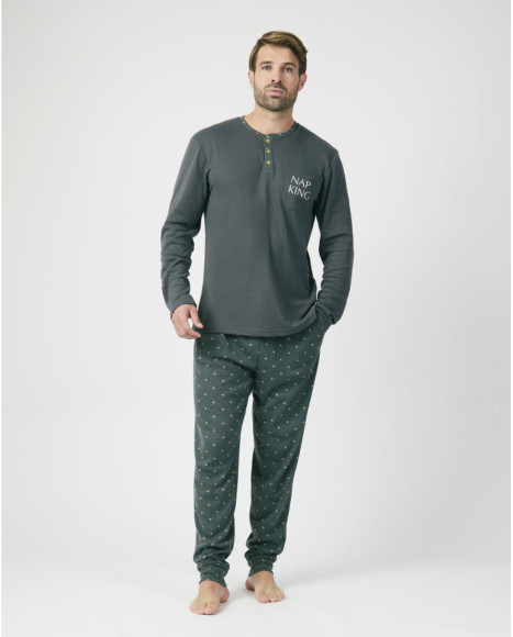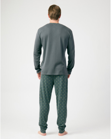 Pijama de hombre compuesto por una camiseta de manga larga en color verde oscuro con cuello redondo y tapeta de botones, decorada con un pequeño estampado en el pecho, junto con un pantalón largo en verde con discretos motivos geométricos en amarillo. El tejido suave y confortable proporciona bienestar durante la noche, mientras que el diseño moderno y funcional asegura comodidad y libertad de movimiento. Una opción perfecta para descansar en casa con estilo práctico y actual.