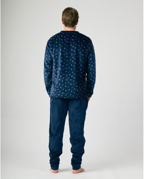 Pijama de hombre confeccionado en tejido cálido y afelpado, formado por una camiseta de manga larga en azul marino con estampado completo de pequeños motivos geométricos en tonos verdes y azules, y un pantalón largo liso a juego en el mismo color. Su diseño moderno y juvenil aporta estilo, mientras que la suavidad del tejido asegura abrigo y comodidad durante las noches frías. Una prenda perfecta para relajarse en casa con confort y un aire actual.