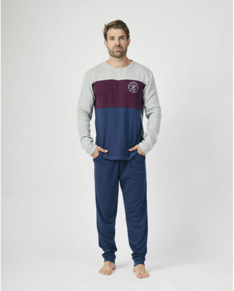 Pijama largo de hombre confeccionado en tejido suave y cálido, ideal para los meses fríos. Consta de una camiseta de manga larga en diseño moderno de bloques de color gris, burdeos y azul, con detalle estampado en el pecho, y un pantalón largo liso en azul a juego. Su estilo actual combina confort y practicidad, ofreciendo una prenda perfecta para descansar en casa con comodidad y un look juvenil.