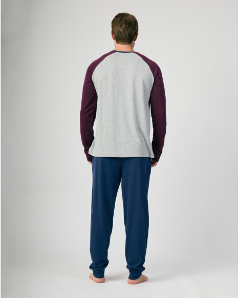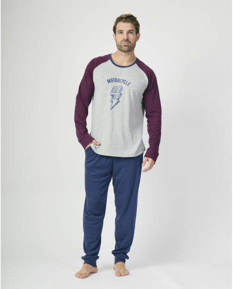 Pijama de hombre confeccionado en tejido suave y abrigado, compuesto por una camiseta de manga larga en color gris vigoré con mangas burdeos y cuello redondo en azul, decorada con un estampado frontal de estilo motociclista. El conjunto se completa con un pantalón largo liso en color azul a juego. Un diseño moderno y juvenil que aporta comodidad y estilo para disfrutar de noches de descanso o momentos de relax en casa.