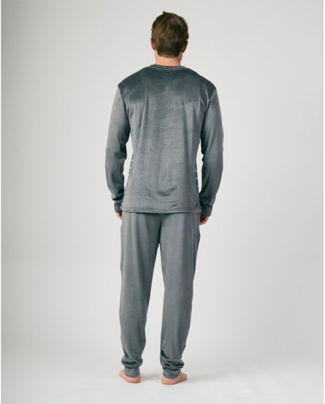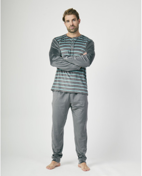 Pijama largo de hombre confeccionado en tejido suave y cálido, ideal para los meses fríos. Está compuesto por una camiseta de manga larga en gris con estampado de rayas en tonos verdes y tapeta con botones, y un pantalón largo liso a juego en gris. Su estilo moderno y juvenil aporta frescura, mientras que la suavidad del tejido asegura comodidad y abrigo durante toda la noche. Perfecto para disfrutar de momentos de relax en casa con confort y estilo.