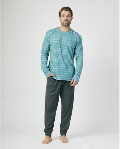 Pijama de hombre confeccionado en tejido cálido y confortable, ideal para el invierno. Consta de una camiseta de manga larga en color verde con estampado de finas rayas horizontales blancas y detalle de bolsillo estampado, combinada con un pantalón largo liso en gris oscuro. Su diseño moderno y juvenil aporta frescura, mientras que la suavidad del tejido asegura abrigo y comodidad en las noches más frías. Perfecto para descansar en casa con estilo y confort.